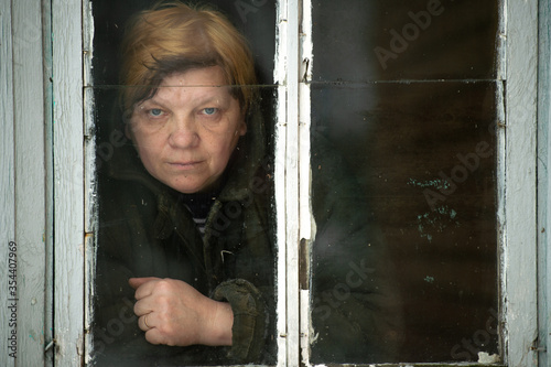Portrait of adlt self isolated lady dis earning and looking out of window during coronavirus covid 19 pandemia. Old lady at home on quarantine. Social distance and psychological crysis.