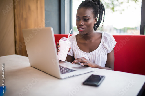 Portrait of afro american student female typing answers to friends while working on a laptop with wireless internet connection drinking milkshake in cafe