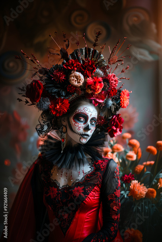 Portrait of an elegant woman made up as a Catrina with a flower dress, her head is covered with a wreath of flowers. Day of the Dead face painting, flower background