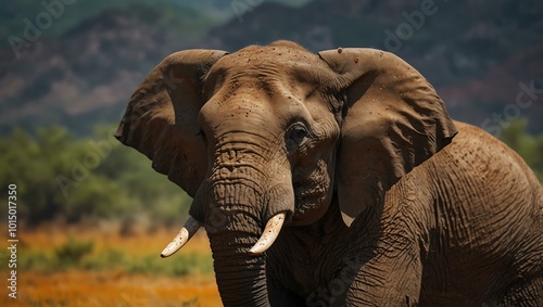 Portrait of an elephant set against a vibrant backdrop.
