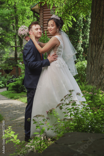 Portrait of an international loving couple of newlyweds against the backdrop of nature and flowers
