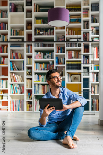 Portrait of barefoot young man sitting in front of bookshelves on the floor with digital tablet