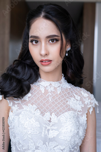 Portrait of beautiful bride with beautiful hairstyle. Makeup artist working with young bride. Gorgeous bride with fashion makeup and hairstyle in a white wedding dress.