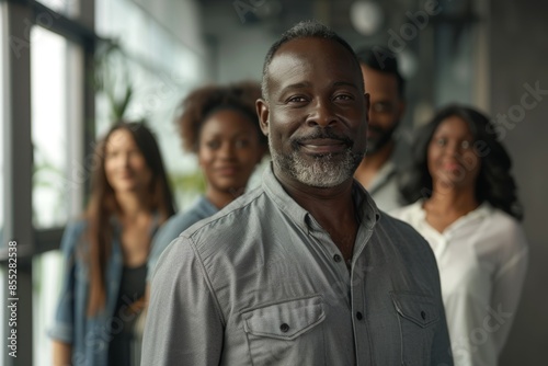 Portrait of black man leading teamwork, company vision, and happy workers. Business, diversity, and smile professionals unite, motivate, and assist leaders.