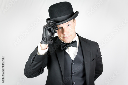 Portrait of British Gentleman in Dark Suit and Leather Gloves Politely Doffing Bowler Hat. Concept of Butler and Professional Hospitality. Vintage Style and Fashion.