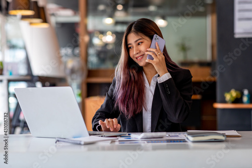 Portrait of Business young woman working on laptop computer doing finances,accounting analysis,report,data and pointing graph at the office.