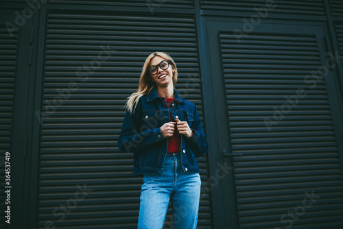 Portrait of carefree young woman with eyewear laughing while posing at camera.Blonde hipster girl in eyeglasses dressed in denim wear standing on black promotional background wit copy space area