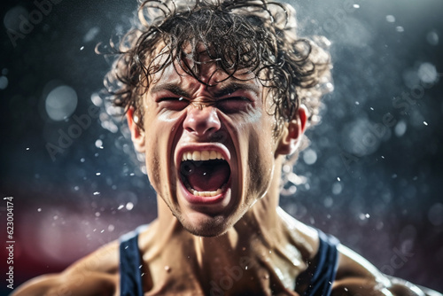 Portrait of champion athlete on stadium , emotions of a winner, joy, delight, emotional, rain, splash drops