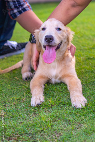 Portrait of cheerful golden retriever puppy sitting on grass