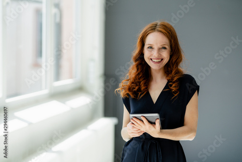 Portrait of content redheaded businesswoman with digital tablet in a loft