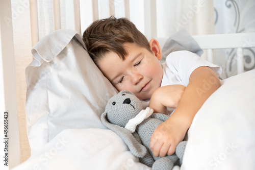 Portrait of cute little boy sleeping in bed with rabbit toy