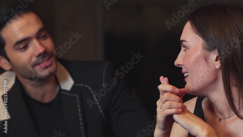 Portrait of focus beautiful woman talking with couple while looking at smartphone with serious face at bar. Capturing natural face beauty with dressing up social interaction at night club. Vinosity.