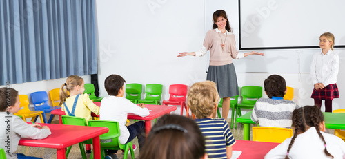 Portrait of friendly female teacher standing near whiteboard with schoolgirl during lesson in classroom