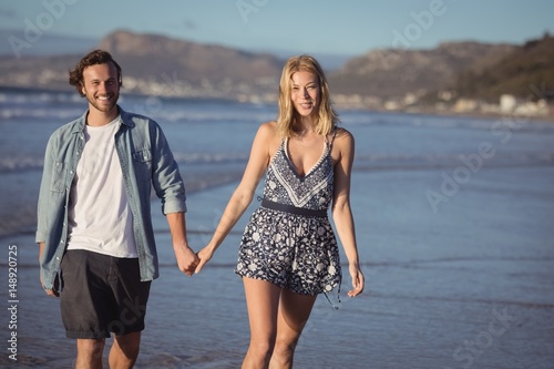 Portrait of happy couple holding hands on shore