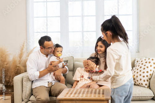 Portrait of happy love asian big family father and mother with asian baby and little girl happy birthday, party, celebration, cake, surprise, grandfather with grandmother smiling together.Family party