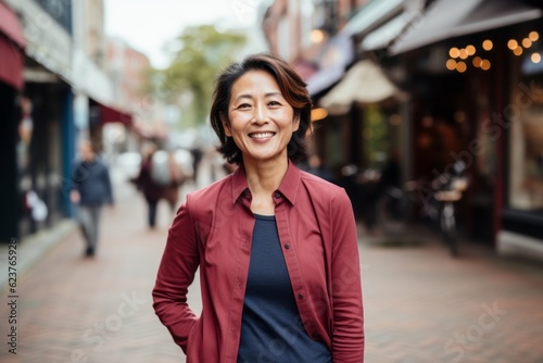 Portrait of happy mature businesswoman walking in city street. Asian woman wearing formal clothes.