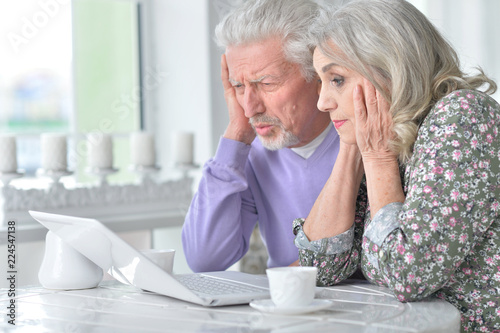 Portrait of happy senior couple using laptop