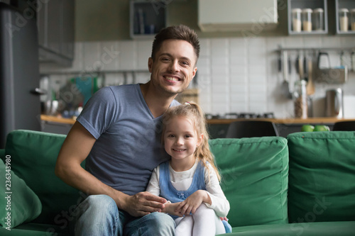 Portrait of happy smiling father with preschool daughter, father sitting on sofa at home together with little girl, kid sitting near dad, look at camera
