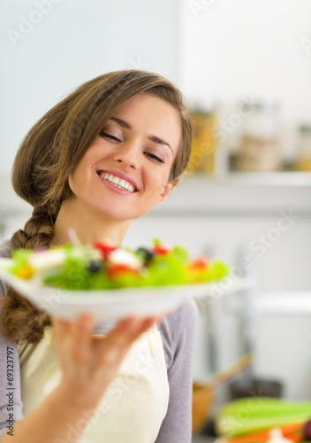 Portrait of happy young housewife showing salad