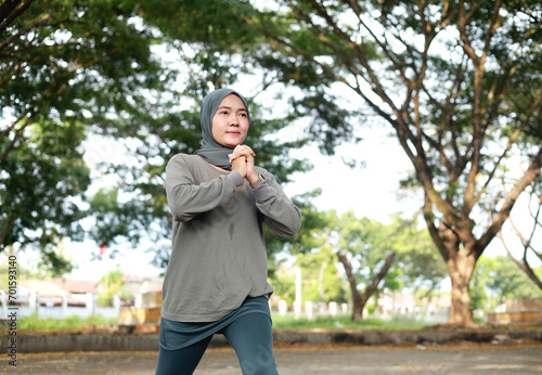 portrait of healthy asian woman with hijab doing exercise at the park in the morning
