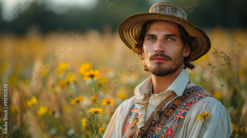Portrait of Latvian Handsome Man Wearing Traditional Dress in Evening Sunset, Showcasing European Cultural Heritage, Vibrant Colours and Handcrafted Details, with Embroidery, Outdoor summer Grass Fiel