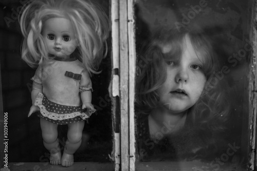 Portrait of lonely little child with an old doll looking out of window with relections