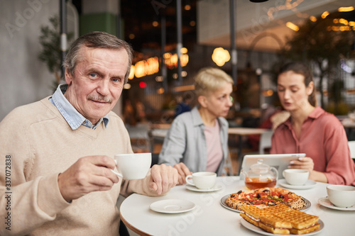 Portrait of mature man drinking tea and looking at camera while having lunch with his family in cafe