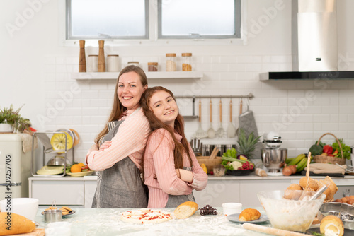 Portrait of mother and teen daughter in arms crossed smiling to camera in the kitchen. Family preparing for baking bakery together. Happy weekend