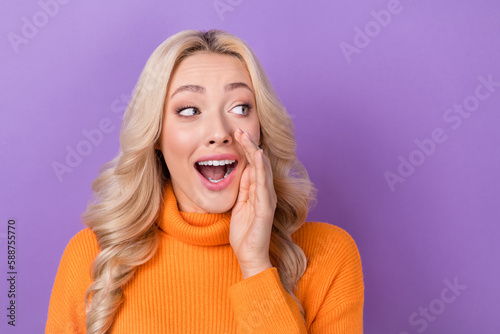 Portrait of optimistic fancy woman elegant hairdo wear pullover look empty space presenting shopping isolated on violet color background