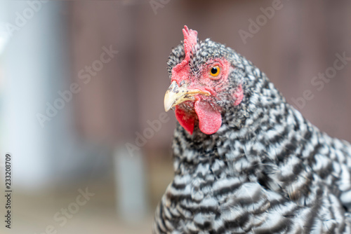 Portrait of Plymouth Rock Chicken (Barred Rock hen) on the farm.