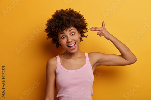 Portrait of positive teenage girl makes suicide gesture, shoots in temple with fingers, gazes happily at camera, wears casual t shirt, feels bored, tries to amuse herself, stays at home, isolated