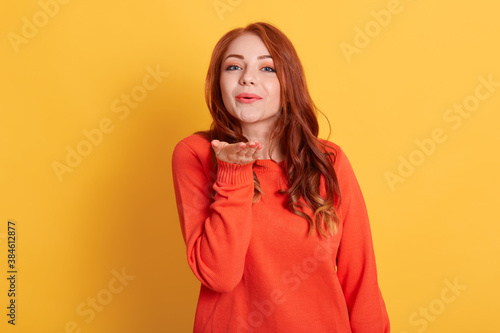 Portrait of pretty friendly girl in casual orange jumper, blowing air kiss with pout lips palm at camera isolated on yellow background, red haired saying goodbye to somebody.
