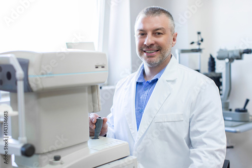 Portrait of professional middle aged eye doctor sitting with ophthalmologic device in the cabinet and smiling at camera