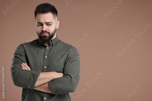 Portrait of sad man with crossed arms on brown background, space for text