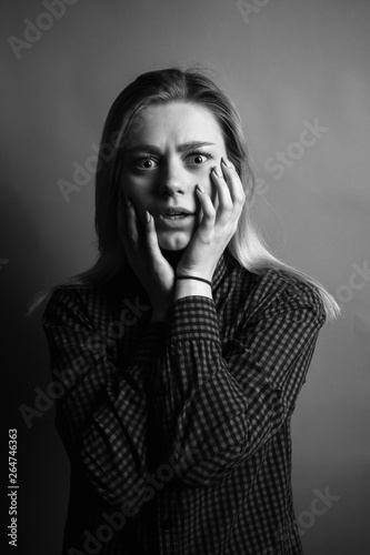 Portrait of scared young woman. Black and white