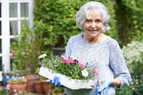 Portrait Of Senior Woman Planting Flowers In Garden
