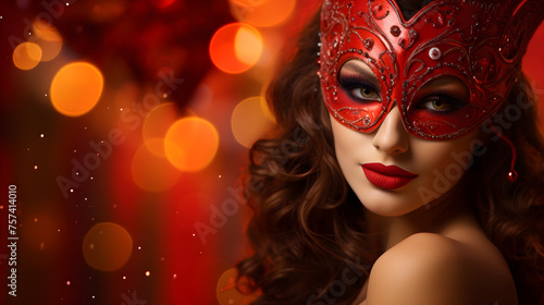 Portrait of sexy seductive woman with bright makeup and carnival red mask on red background with bokeh. Concept masquerade seductive female image. Venetian Carnival.