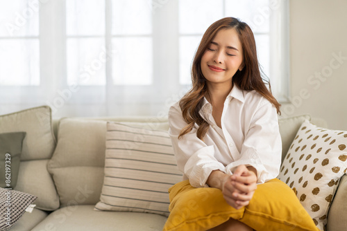 Portrait of smiling beautiful pretty asian woman clean fresh healthy white skin posing smile in pajamas white clothes, skincare, lady, model, cosmetic, fashion.Girl relax, enjoy at home.asia beauty