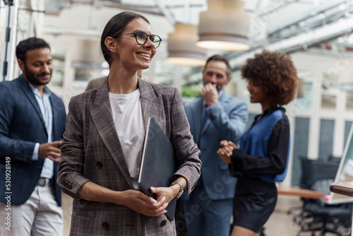 Portrait of smiling businesswoman in glasses standing in modern office on colleagues background