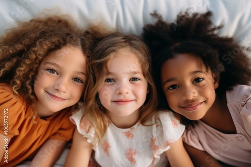 Portrait of smiling diverse three little girls laying in bed