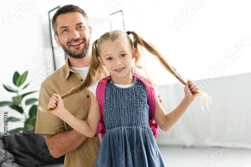 portrait of smiling father and little daughter with backpack at home, back to school concept