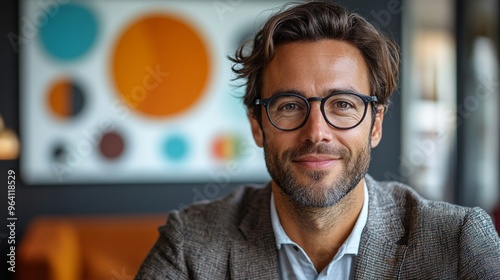 Portrait of Smiling Man with Glasses in Modern Art Gallery Background Indoor
