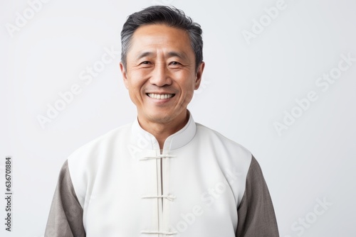 Portrait of smiling mature asian priest standing over white background.