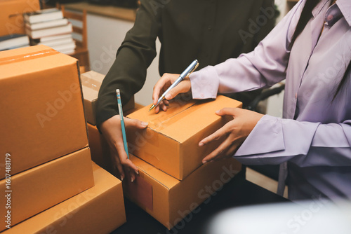 Portrait of Starting small businesses SME owners, two Asian woman check online orders Selling products working with boxs freelance work at home office, sme business online small medium enterprise