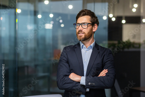 Portrait of successful mature investor, senior businessman inside office looking towards window smiling with crossed arms, man in glasses and business suit.