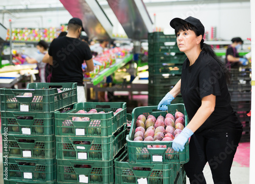 Portrait of woman employee working at fruit warehouse carrying box with mangos