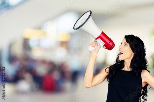 Portrait of woman holding megaphone, dressed