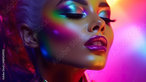 portrait of young beautiful woman with multi colored dye stylish makeup, pretty model female with multicoloured paint make up