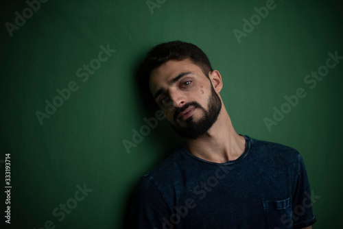 Portrait of young brunette Indian Kashmiri man in casual tee shirt in green copy space studio background. lifestyle and fashion.