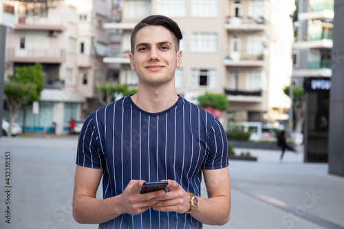 Portrait of young handsome man of Arabic ethnicity on the city streets. Iranian guy over with hipster hairstyle wearing casual attire. Close up, copy space for text.
